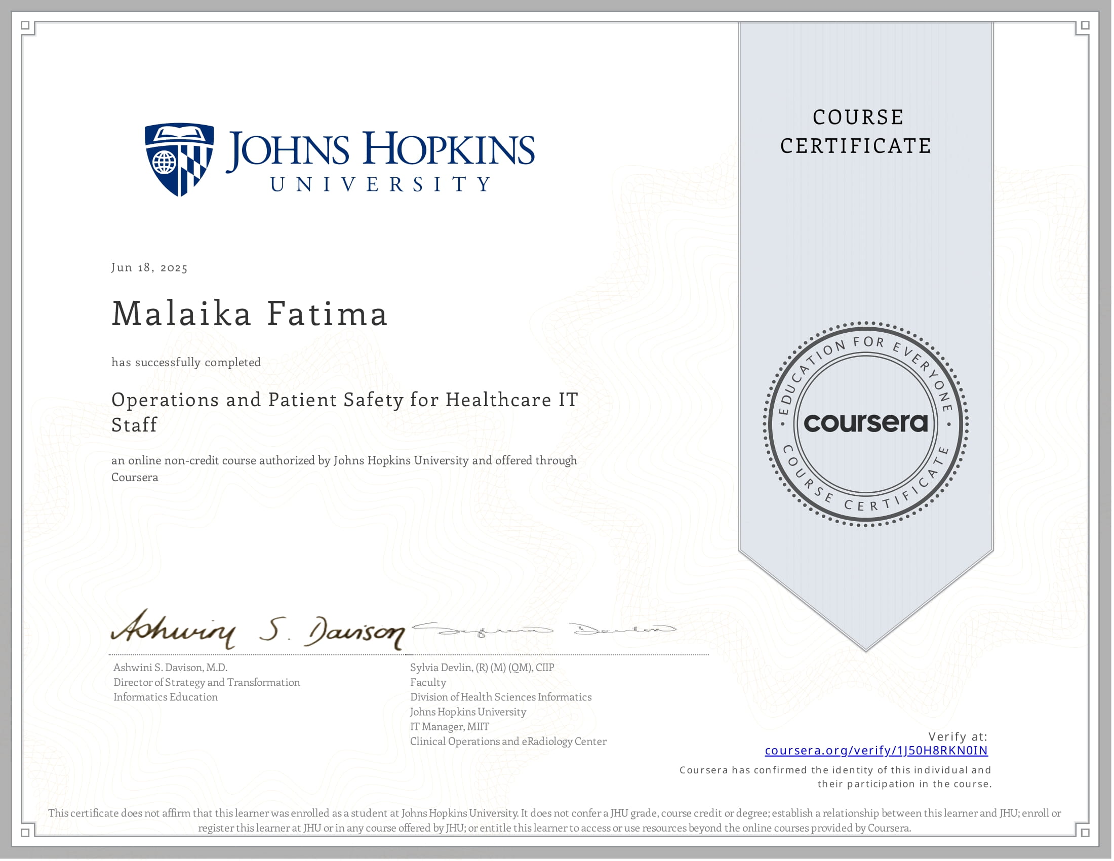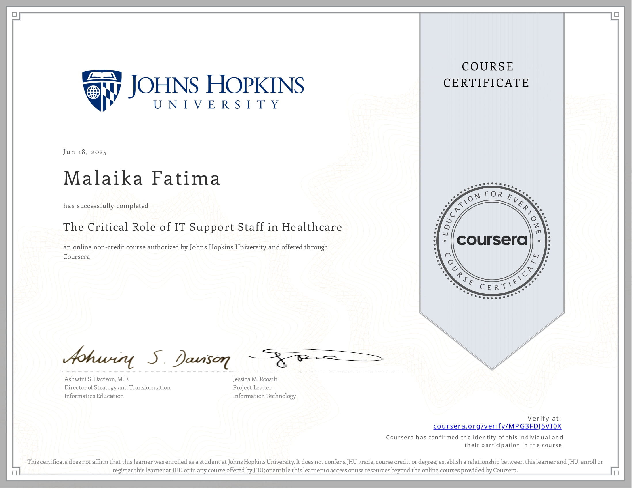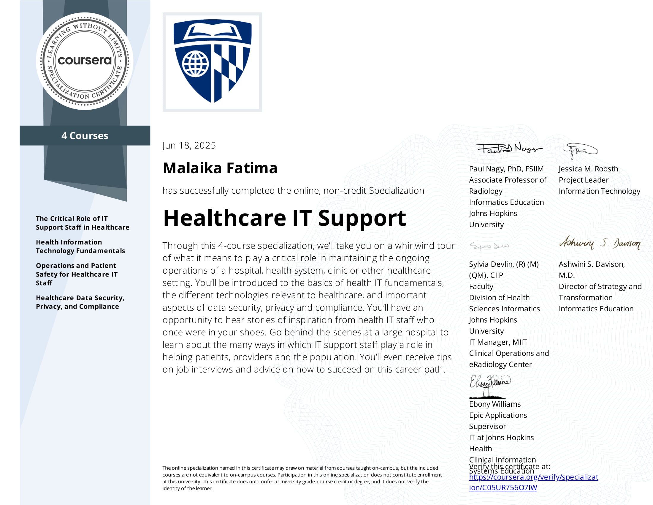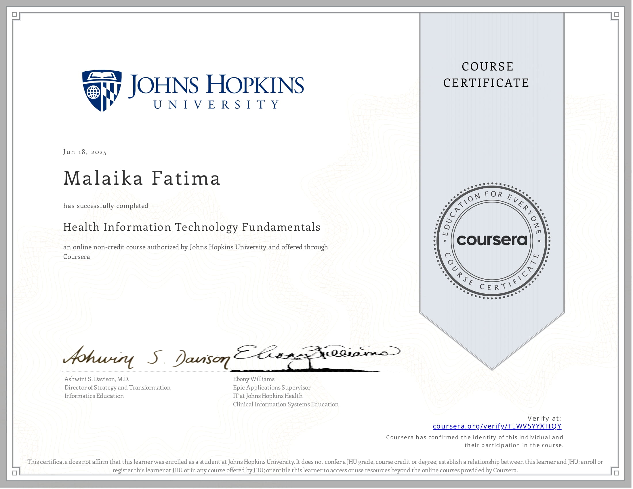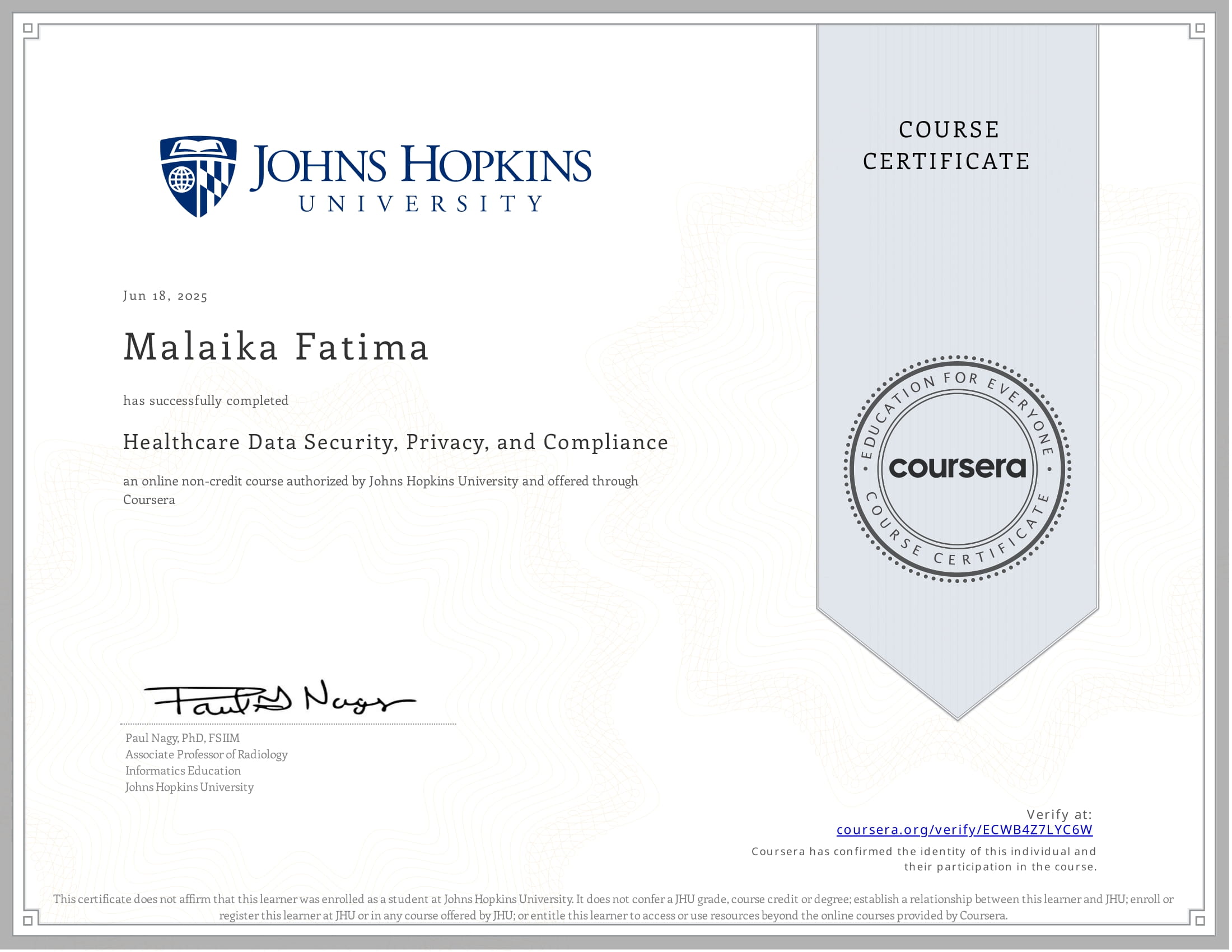 Hi, I'm someone who loves to learn and try new things. I've taken online courses from top universities like Yale, Michigan, and Johns Hopkins, where I explored topics like economics, social justice, cybersecurity, machine learning, and healthcare IT. I’ve also scored the highest in my class in both 2022 and 2025, which shows how dedicated I am to my studies.